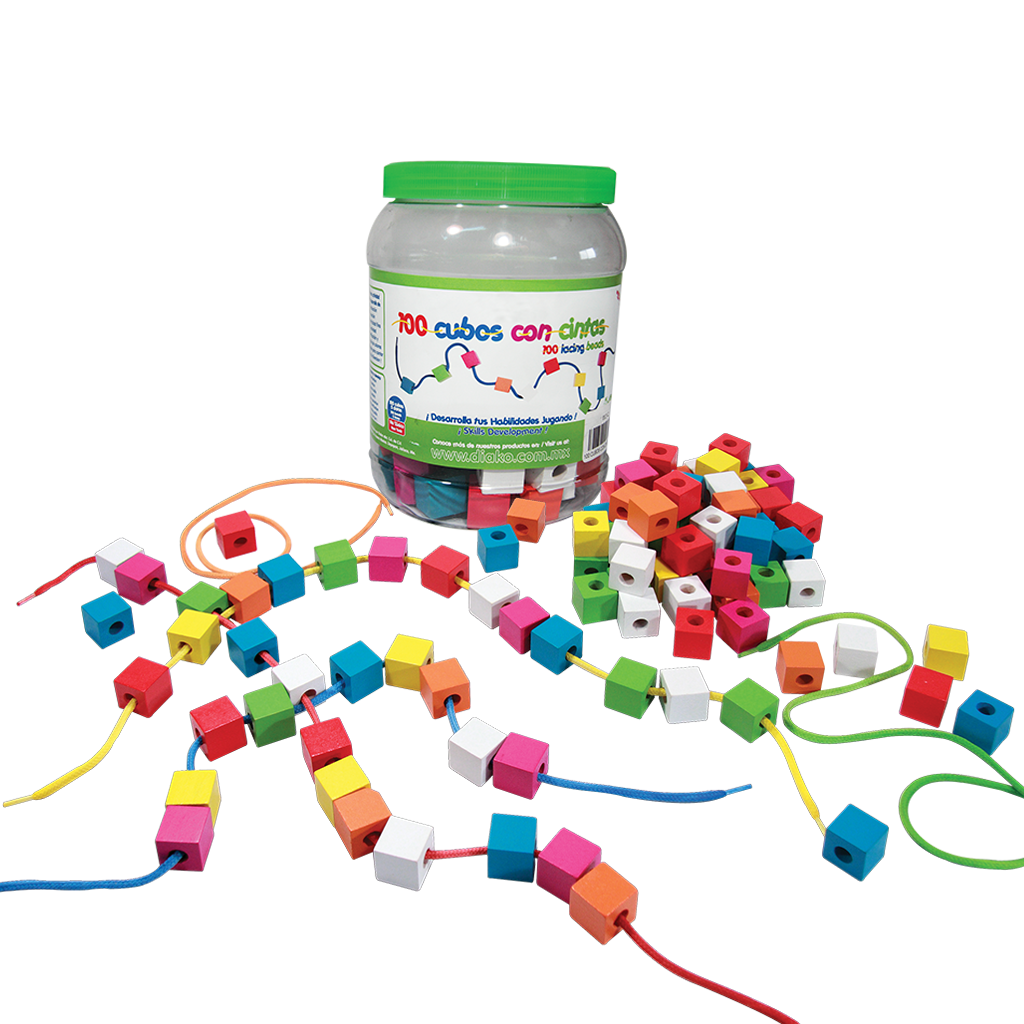 Cubos de madera de colores con cintas para ensartar.