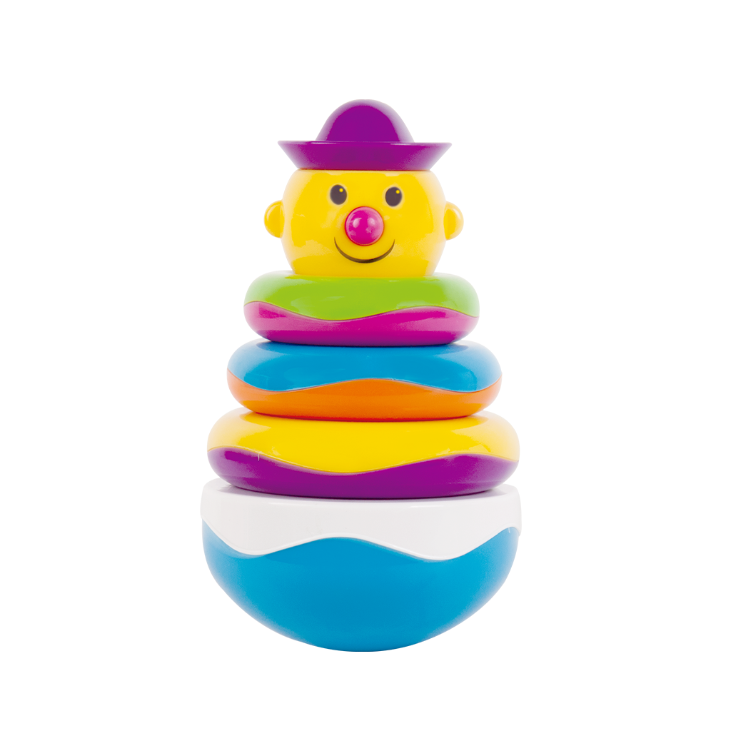 Pirámide de plástico para bebé. Excelente actividad que desarrolla la habilidad de resolución de problemas por medio de la identificación, clasificación y apilado de los aros por color, tamaño y forma. Piezas: 5 Medida: 11 x 11 x 21 cm Edad: 2+