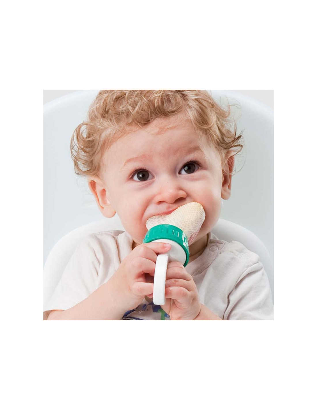 - Ideal para dar frutas, quesitos, verduras, galletas, etc. Sólo los nutrientes atraviesan la malla doble de seguridad. Las pieles, los huesos, etc. se quedan en la malla.