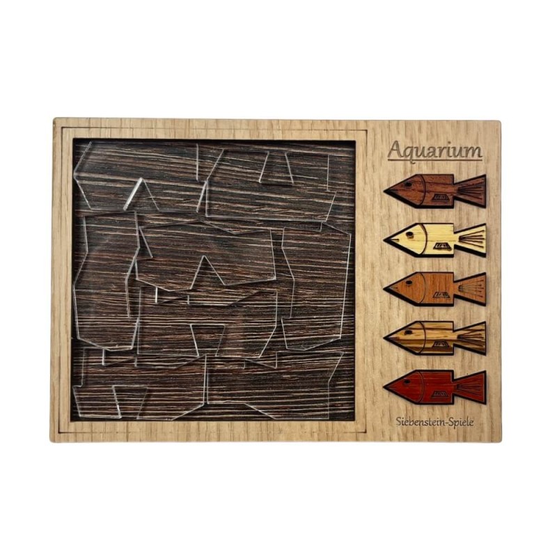 Aquarium es un puzzle de ingenio en el que tu objetivo será introducir los 5 peces de madera junto a las piezas de plexiglás dentro del marco de madera.