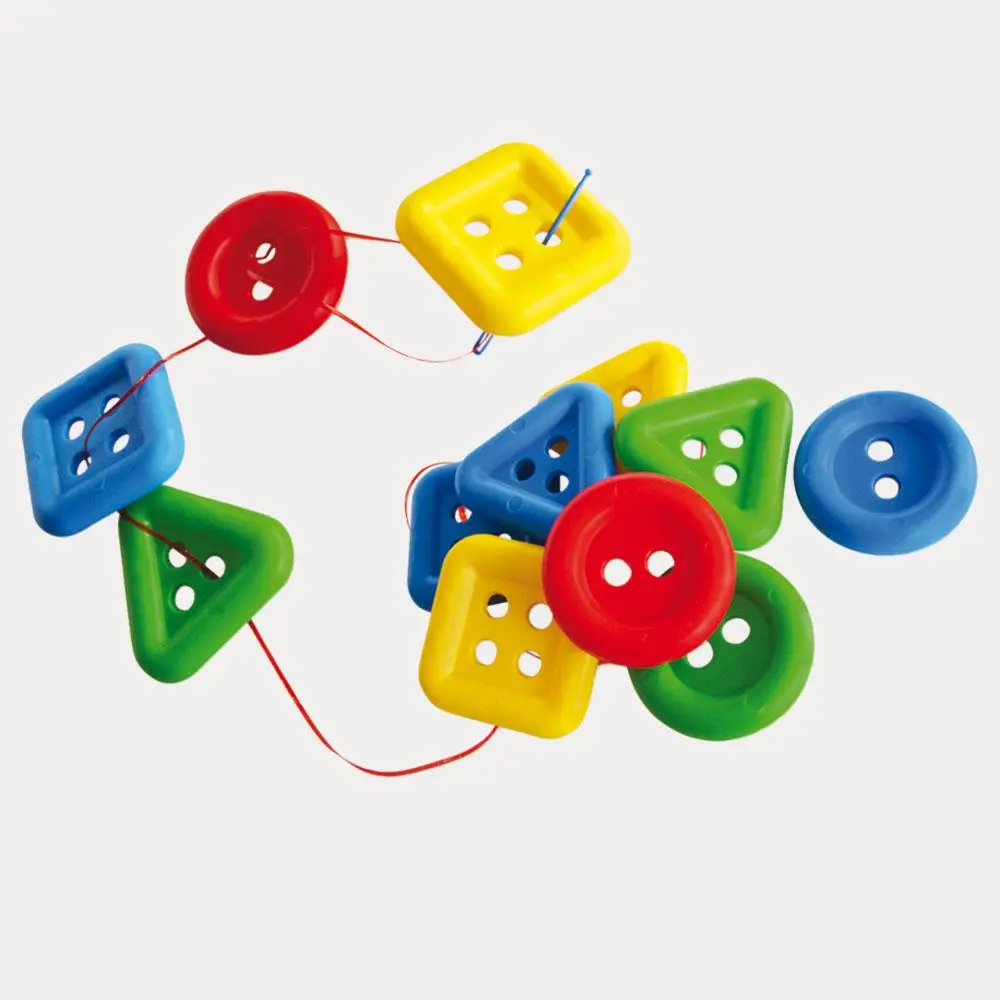 Permite al alumno reconocer las diferentes formas geométricas, complementando el aprendizaje con el ensarte entre cada pieza, realizando trenes de formas, secuencias, etc. El complemento del juego con agujas plásticas con reborde permite practicar el movimiento de pinza.