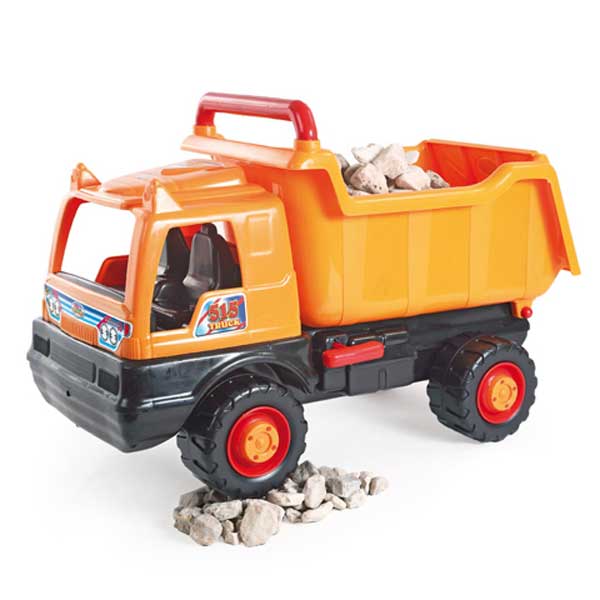Tiene una espaciosa cabina y un volquete inclinable con puerta trasera para proteger la carga. Dispone de una palanca para fijar el volquete y evitar que se eleve. Está fabricado en plástico muy resistente y cuenta con un asa en la parte del volquete para facilitar su transporte.