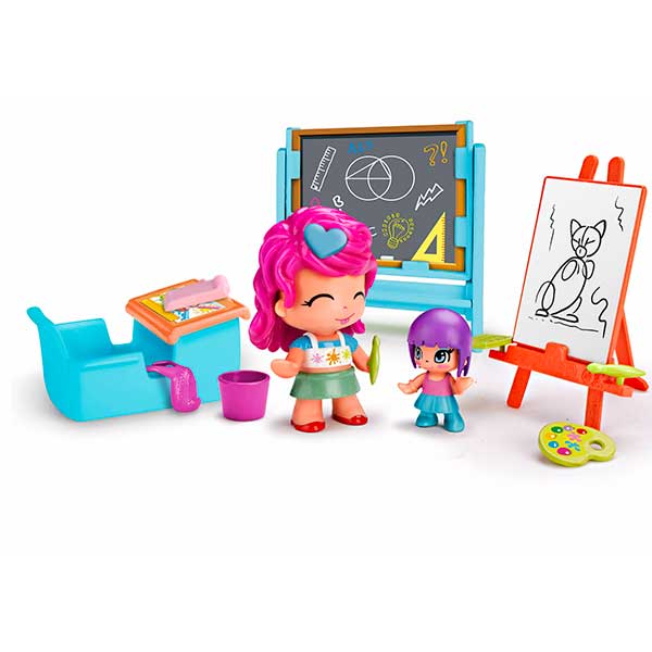 Podrás enseñar a tus Pinypon a usar un caballete y convertirles en auténticos artistas. La clase incluye una profesora Pinypon, una niña Pinypon, un pupitre, una pizarra, un caballete y muchos accesorios, igual que un colegio de verdad!