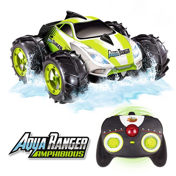 Coche Aqua Ranger anfibio a radio control que funciona tanto en tierra como en agua o nieve. También tiene función de giros 360º. Funciona con 4 Pilas AA y una pila 9V incluidas. Edad recomendada: +8 años.