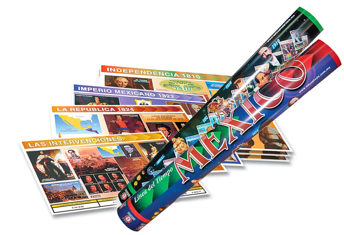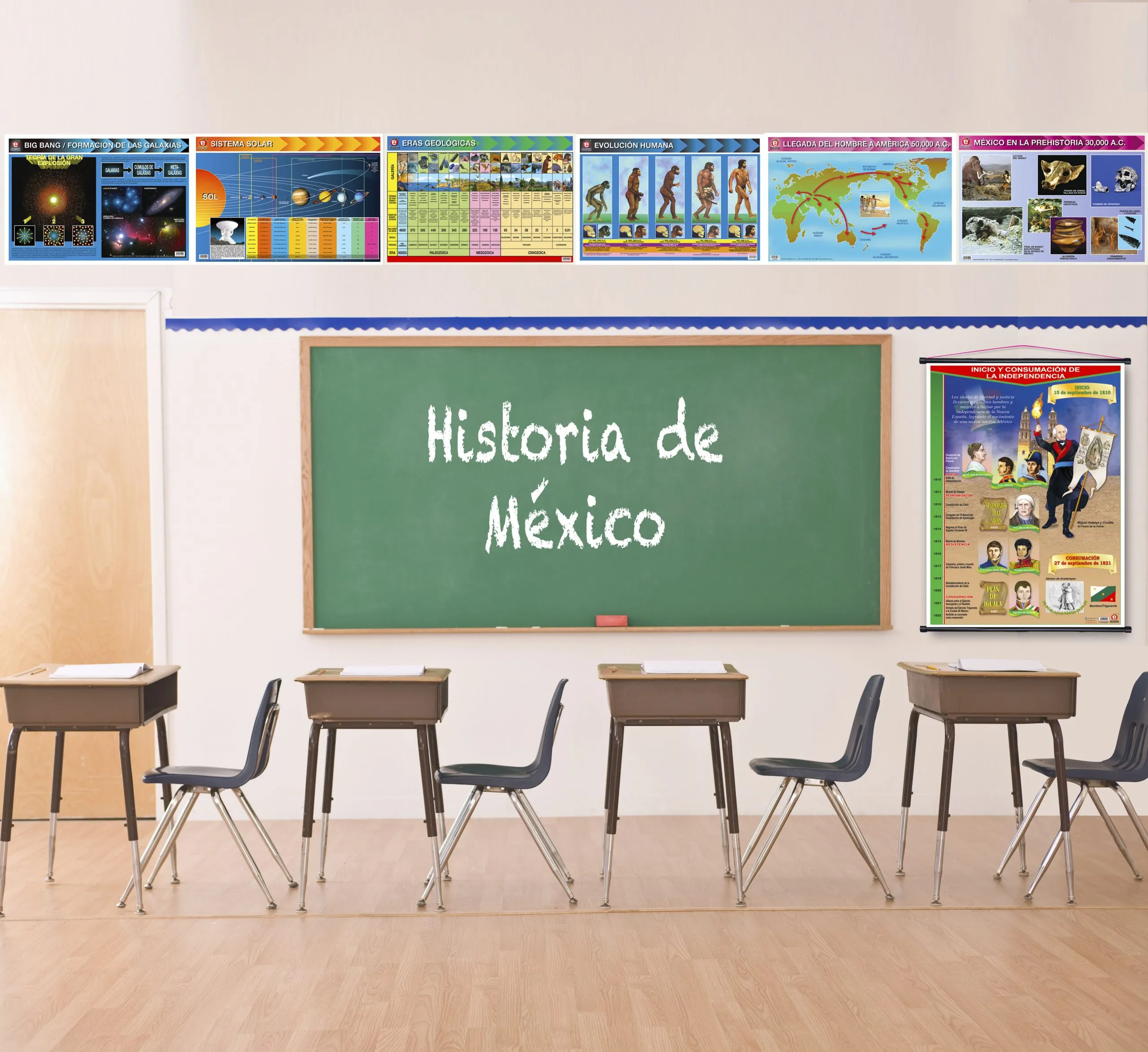 Es un excelente material didáctico, útil para el aprendizaje y/o reforzamiento de la historia de México desde la formación del universo. Producto impreso en papel de 1a clase. Incluye perchas de plástico autoadheribles para colgarlo.