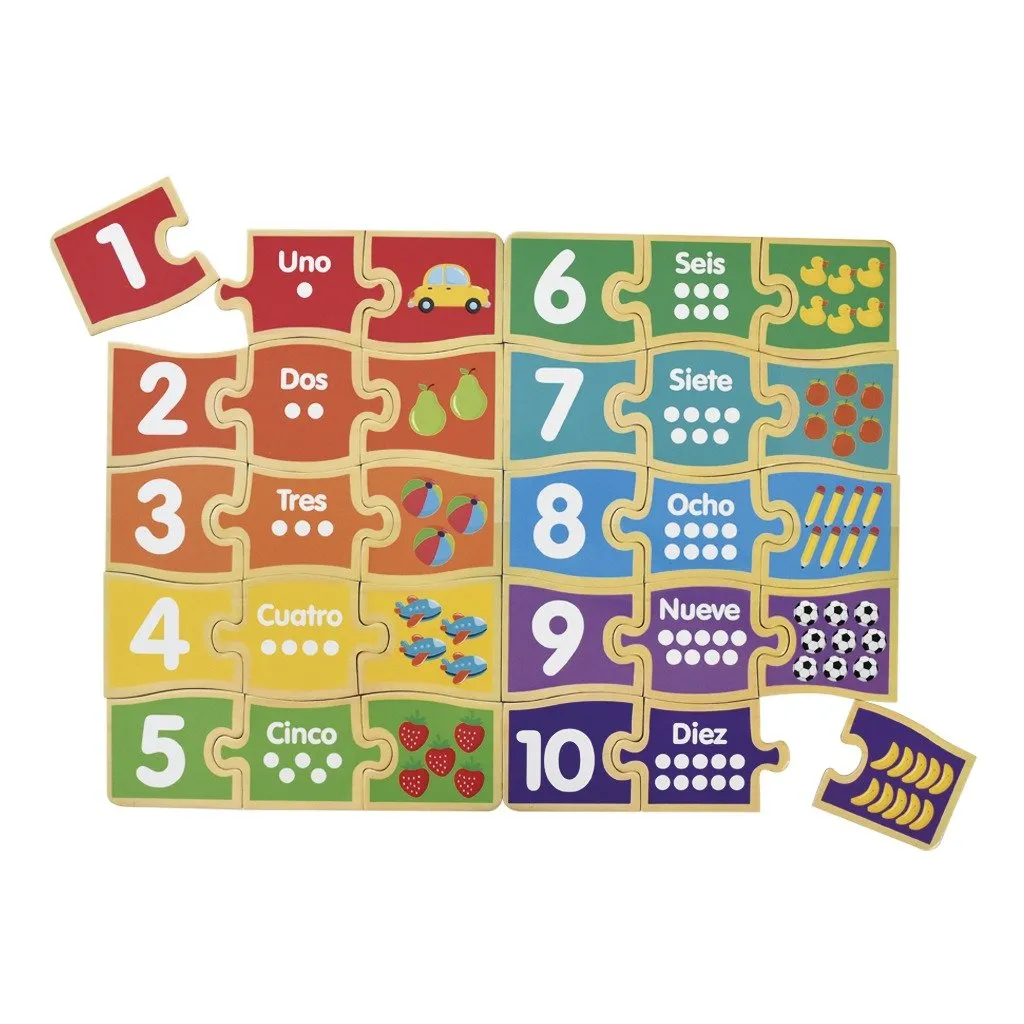 Rompecabezas de cartón con números del 1 al 10 en el cual hay asociar las piezas con el numero y el conjunto adecuados. Ideal para el desarrollo de las habilidades matemáticas y de lenguaje, así como la atención y el aprendizaje de colores.