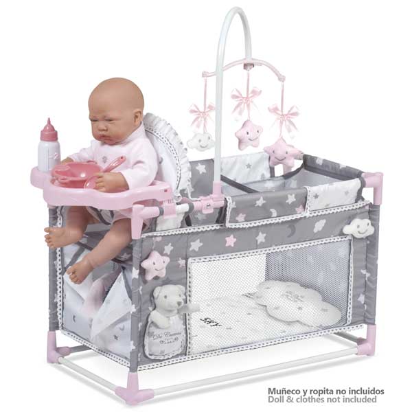 Esta cuna tiene un carrusel donde cuelgan estrellitas y una nube que le ayudarán a dormirse. También incluye mantita y almohada en forma de nube, peluches, 3 perchas para colgar la ropita y accesorios para la comida como un platito, biberón y cubiertos.