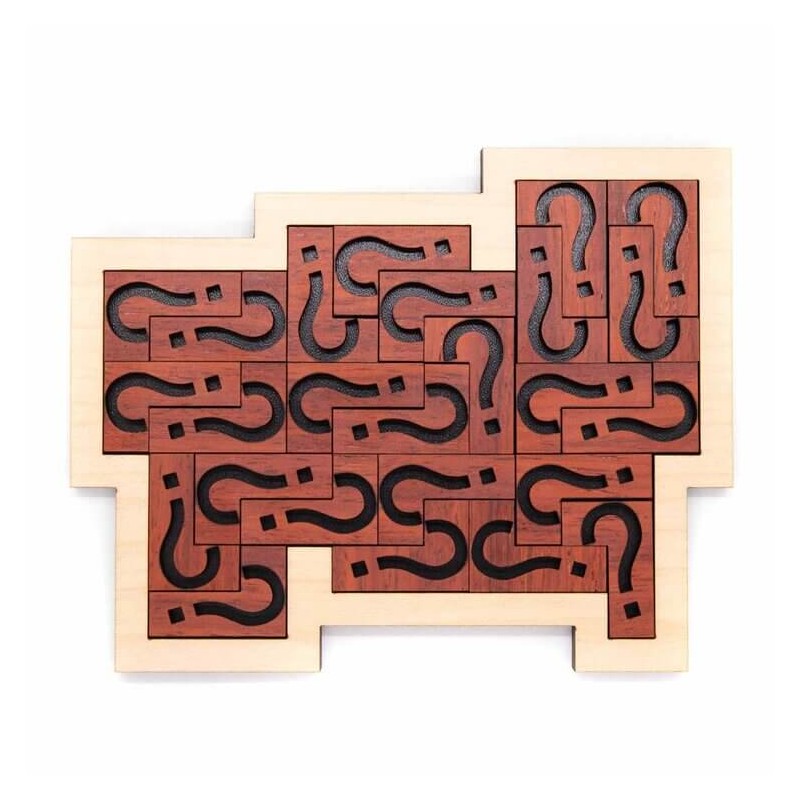 Die Fragezeichen se traduce como «Los signos de interrogación». El objetivo de este rompecabezas es encajar los signos de interrogación en el marco, de manera que todos estén orientados en la misma dirección. En esta versión del rompecabezas, los signos de interrogación deben estar orientados hacia atrás para obtener la solución. En la foto de la característica, verás que solo un signo de interrogación está actualmente al revés. Con el marco de forma irregular, descubrirá que este problema es un verdadero desafío.