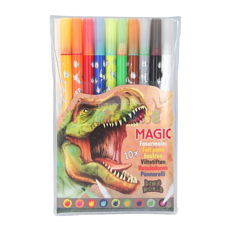 Pintar se convertirá en mágico gracias a Dino World. El set se compone de 9 rotuladores de punta doble y 1 rotulador mágico para pintar por encima de lo ya coloreado. La tinta mágica hará que los 9 colores iniciales se conviertan en 18 tonos diferentes. Los rotuladores de punta doble tienen una punta de pincel (0,5-2 mm) y una punta fina (0,5 mm). Con un maravilloso look de dinosaurios y presentados en un estuche transparente.