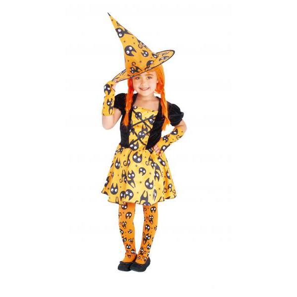 Disfraz Bruja Mininos Naranja compuesto de vestido con estampado de gatitos, sombrero, guantes mitones y medias.
