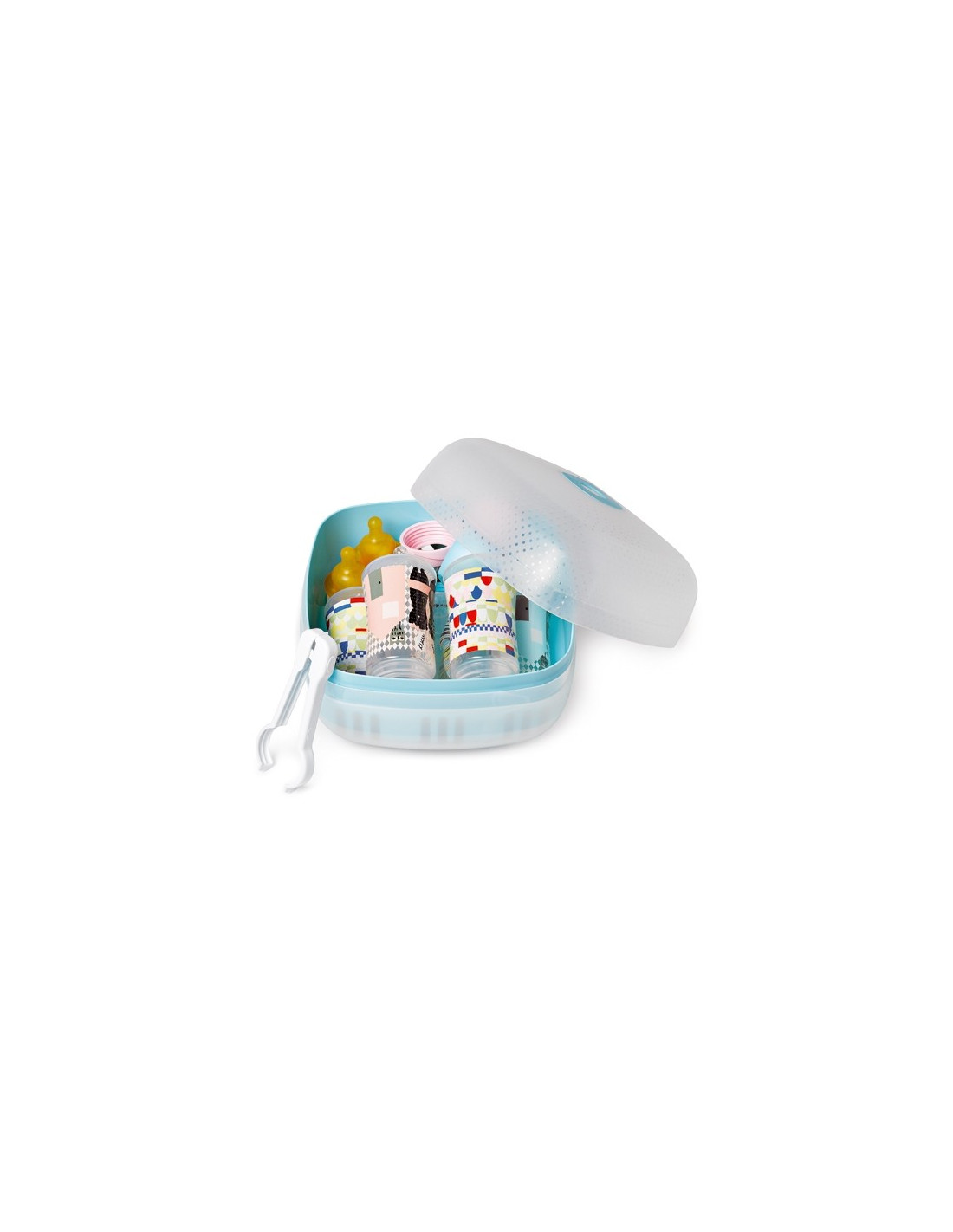 - Los agujeros en su base permiten que pase el vapor de agua, mientras que los soportes para biberones, dado su especial diseño, garantizan que el biberón se esterilice perfectamente tanto por dentro como por fuera.
