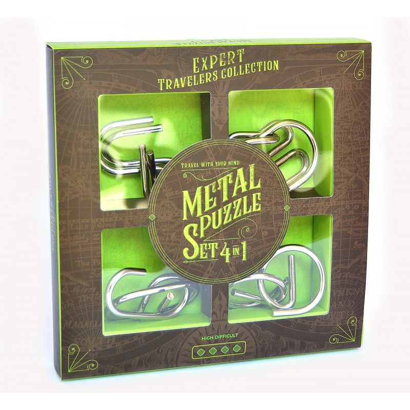 4 rompecabezas de metal en su caja de la colección Serie Viajeros Combo de rompecabezas para jugadores expertos.