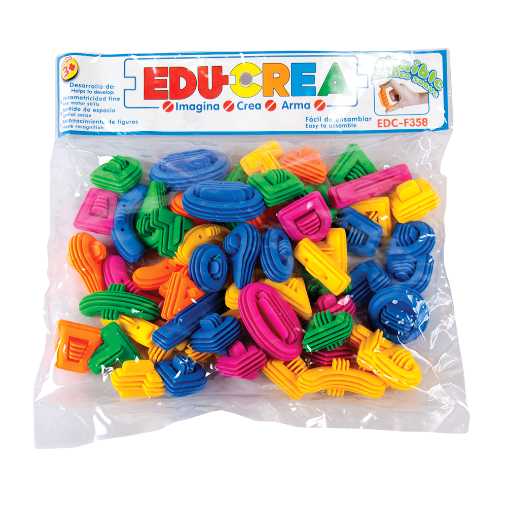 Juego de ensamble con piezas de plástico flexible que se unen entre sí para crear distintas formas geométricas. Crea los diseños que tu imaginación te permita. Desarrolla las habilidades estratégicas, la coordinación ojo-mano, la psicomotricidad fina y la imaginación. Empaque: 31 x 29 x 5 cm/ Pieza: 4 x 4 x 3 cm