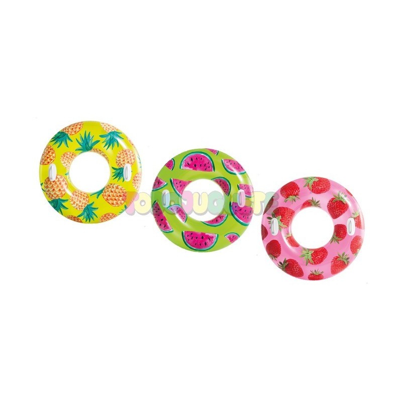 Rueda hinchable. Diseño: Tropical fruits. Diámetro: 107,00CM. Edad recomendada: +9 años. Con asas laterales para mayor seguridad. Disponible en 3 surtidos de diseño. Incluye parche de reparación para pequeños pinchazos o arañazos.