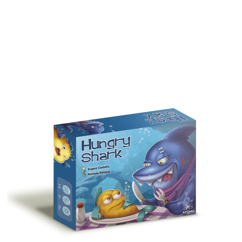 HUNGRY SHARK es un juego de velocidad del autor español Eugeni Castaño, conocido por otros exitosos títulos como el Cargolino Valentino. Ahora nos sorprende con un juego para toda la familia a partir de 6 años, compuesto por 54 cartas y una duración media de 10 minutos.