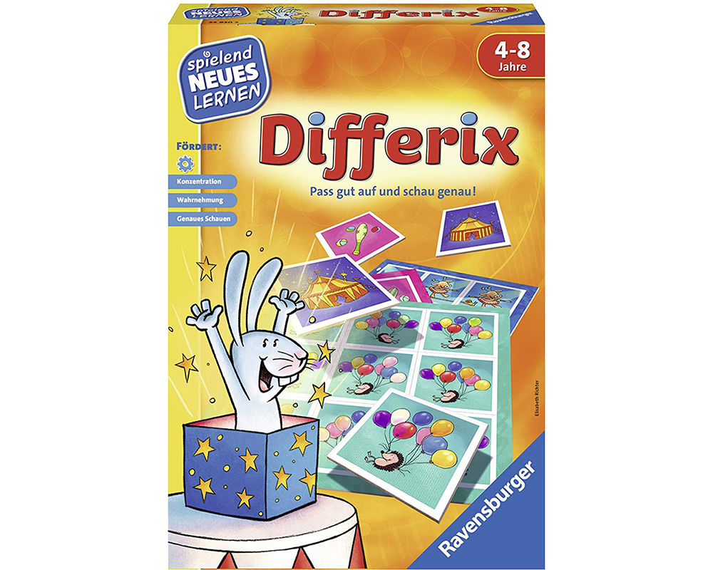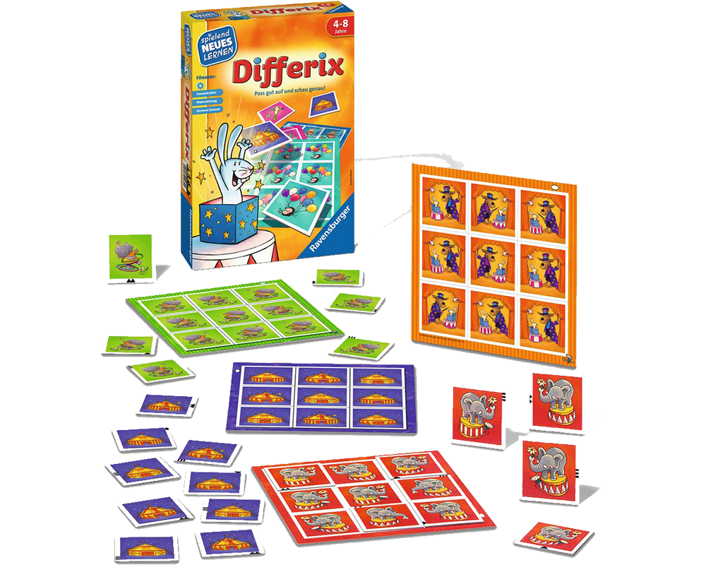 ¡Con Differix necesitarás concentración y una excelente vista! ¿El payaso mira hacia la derecha o hacia la izquierda? ¿Usa un sombrero pequeño o grande? Las imágenes aparentemente son iguales, pero difieren en detalles. El primer jugador en llenar correctamente su tablero será el ganador.