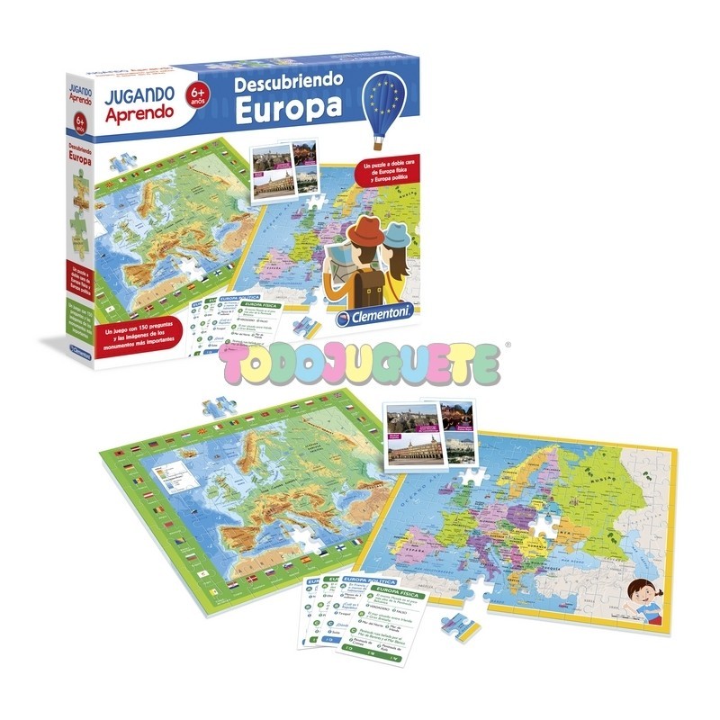 Este fantástico juego 2 en 1 es un puzzle de dos caras con el mapa físico y político de Europa, y un divertido juego de cartas para ponerse a prueba, descubrir muchas curiosidades y datos sobre nuestro continente. Con 150 preguntas.