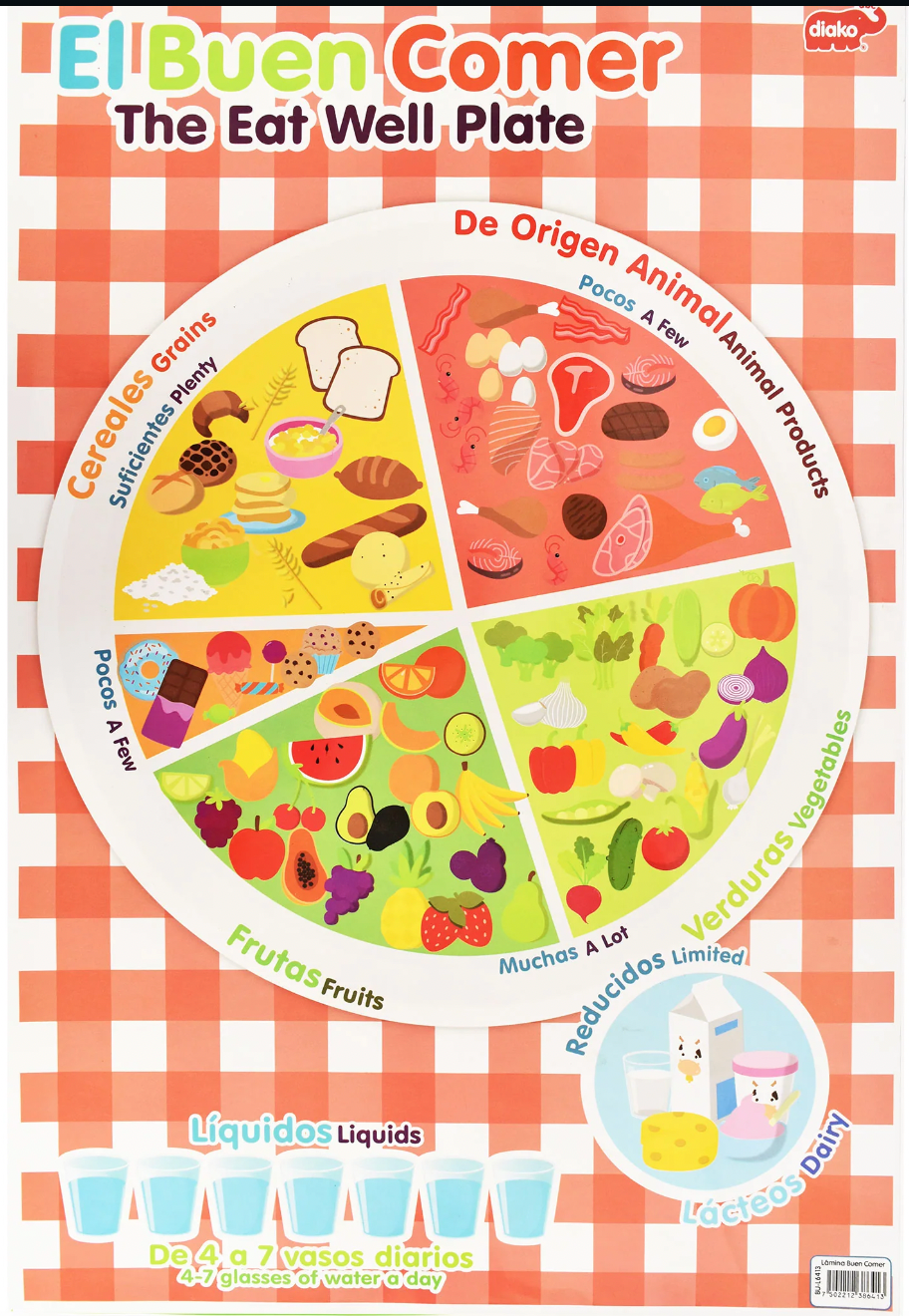 Láminas plastificadas. Contienen el plato del buen comer, frutas y verduras, impresos por ambos lados. Puedes escribir sobre ellas con un marcador para pintarrón y al finalizar borrar con una tela húmeda. Piezas: 1 Medida: 68 x 45 cm