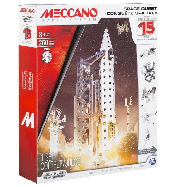 Kit de montaje Cohete Especial de Meccano. Puedes realizar hasta 15 modelos diferentes! Prepara tu imaginación para el despegue y explora el mundo de la ingeniería real con este set de Meccano. Podrás construir un cohete y montar cualquier de los otros 14 modelos intergalácticos incluyendo una nave espacial, un satélite, un módulo lunar y mucho más! El conjunto viene con 260 piezas, 2 herramientas reales e instrucciones fáciles de seguir. Explora las maravillas mecánicas del cosmos y aumentar su imaginación en órbita más alta con Meccano! Edad recomendada: +8 años.