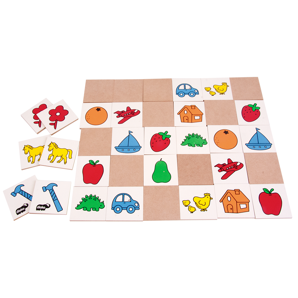 Desafiante y estimulante juego que ayuda a desarrollar la habilidad de memoria y concentración. Figuras sencillas para facilitar y mantener la atención. Material: Fibra de madera Piezas: 28 Medida: 20 x 4.5 x 13 cm