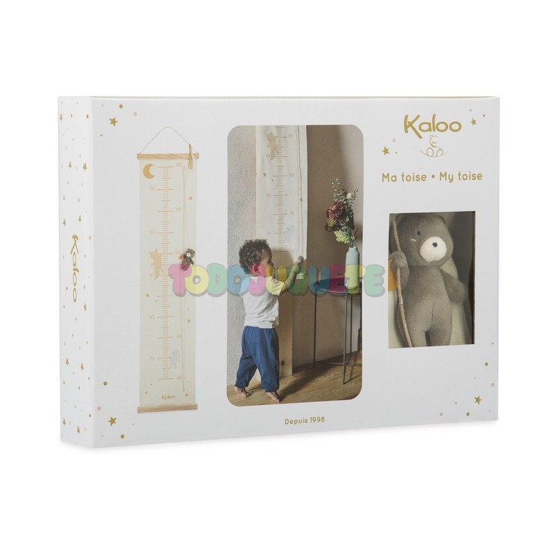 Regalo de recién nacido ideal para ver la evolución del bebé con el transcurso del tiempo. Este bonito medidor de estatura de madera FSC y algodón con una altura de 1,27 m, muy poético, permitirá medir al niño gracias a su osito. Fijado sobre una cuerda, el osito puede ajustarse al tamaño del niño para que pueda ver lo que ha crecido. Para poder desplazar el oso a la talla deseada, bastará con tirar de la cuerda de la parte trasera del medidor. Para poder ajustar de forma óptima la longitud de la cuerda y, por tanto, la posición del oso, deberá pulsarse el botón de la parte trasera del medidor.