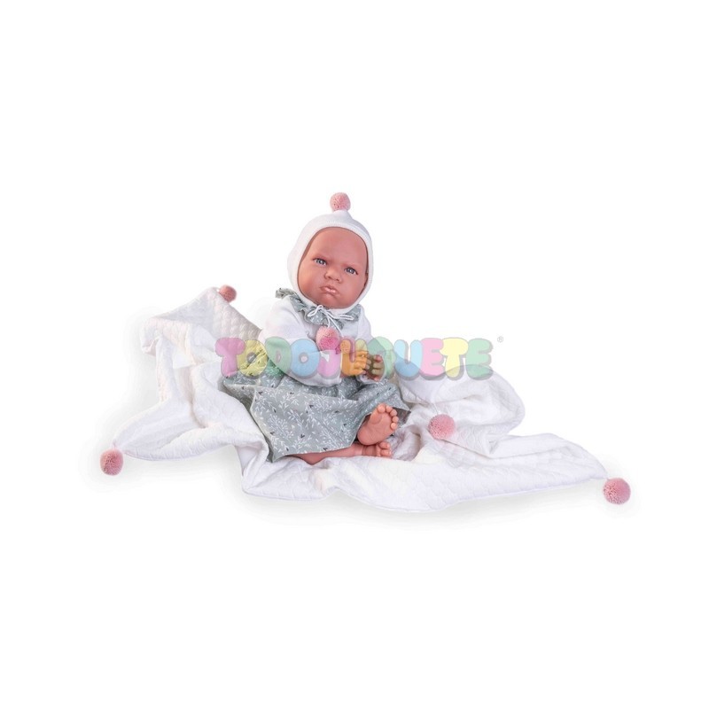 Mi Primer Reborn son muñecas realistas con las que podrás disfrutar como de un bebé casi real. Fíjate en su manicura, el peso o la babita que le asoma entre los labios Una elección perfecta pensando en el juego de los más pequeños. Mi Primer Reborn Berta con faldón es una dulce bebé que está preparada para ir contigo a jugar. Con su faldón de florecitas está muy bonita. Y para que no pase frio, se ha puesto su capota con pompón. Podrás arropar a Berta con su suave toquilla acolchada. Además lleva pañal como un bebé de verdad. Pesa 1905 gr. y mide 52 cm. Incluye un libro de familia para tu Reborn de Muñecas Antonio Juan.
