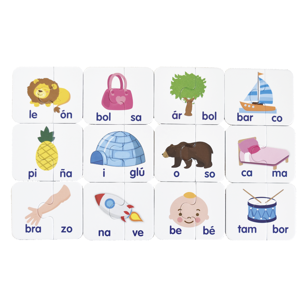 Tarjetas de cartón en forma de rompecabezas que ayudan al aprendizaje lectura, desarrolla el lenguaje y laconcentración, asociación y atención. Con este juego aprenderás palabras que contienen dos sílabas.