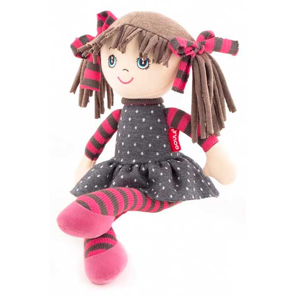 Muñeca Alice de 35 cm, con la cara bordada y vestido marrón estampado. Favorece la afectividad y el desarrollo emocional. Se puede lavar a máquina. Edad recomendada: +24 meses.