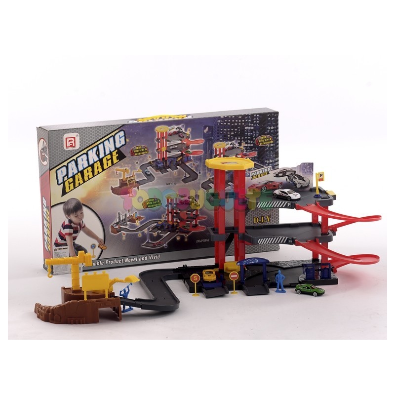 Parking con 3 plantas, 3 coches y 43 accesorios. Incluye gasolinera para repostar, barreras de seguridad, farolas y señales. También incluye area de construcción con dos grúas y un obrero.