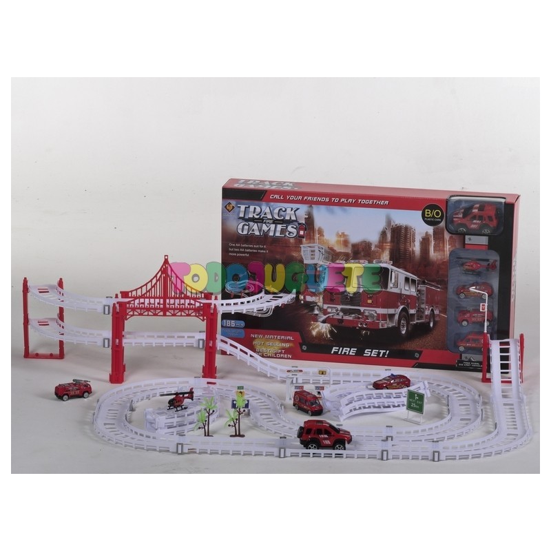 Pista de bomberos de 764 cm de longitud en varios niveles. Incluye cinco vehículos: coche todoterreno 4×4, helicóptero, camión, furgón y coche. Además trae algunas señales indicadoras y algo de vegetación.