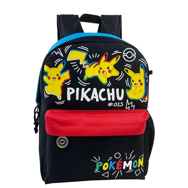 Colorida mochila de Pokémon con un diseño de divertidos Pikachus y detalles en los bolsillos.