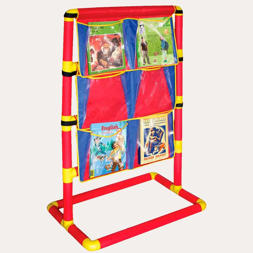 Combinación de estructura tubular, lona y plástico que dan como resultado un atractivo librero para los más pequeños.