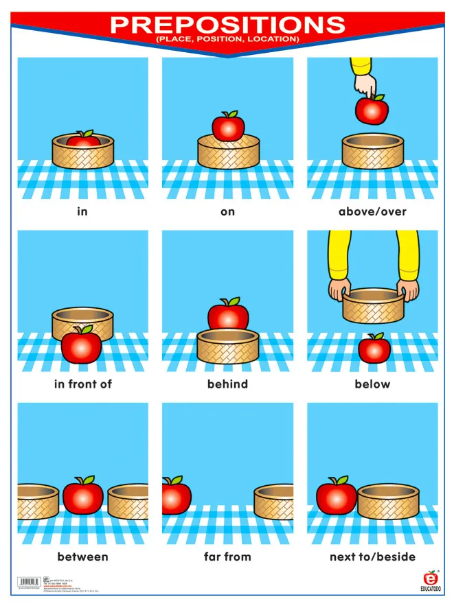 Es un excelente material didáctico, útil para el aprendizaje y/o reforzamiento de las preposiciones en ingles. Producto impreso en papel de 1a clase . Incluye perchas de plástico autoadheribles para colgarlo.