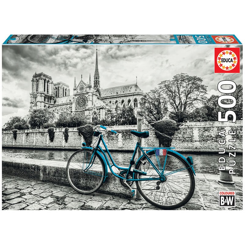 Puzzle Educa Bicicleta cerca de Notre Dame de 500 Piezas significa perfecta armonía entre tradición y calidad; cada puzzle garantiza diversión y satisfacción incomparables.