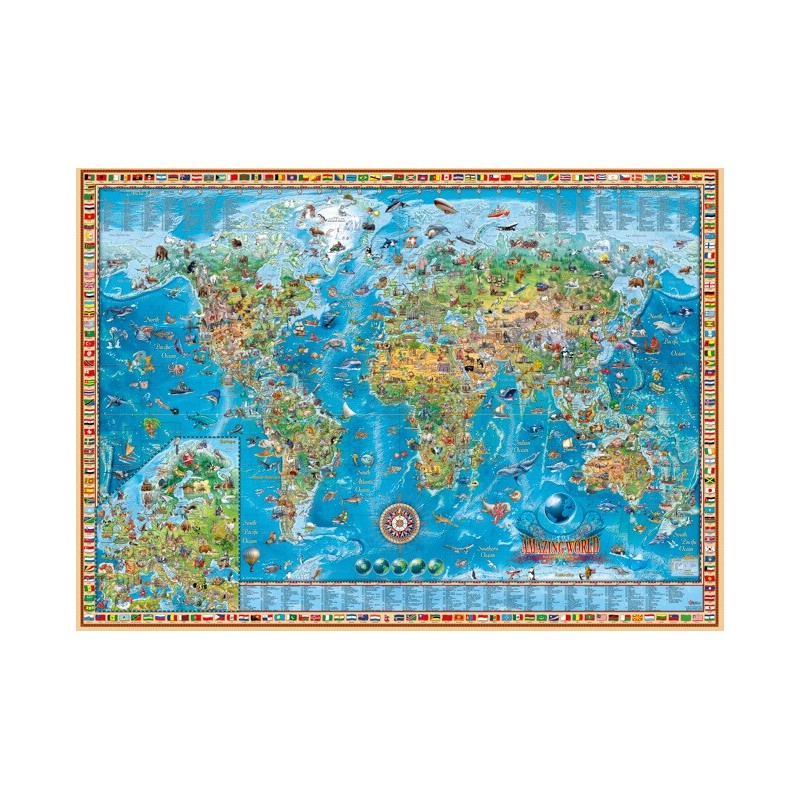 El mapa mundial ricamente ilustrado «Amazing World» muestra las diversas peculiaridades de los países individuales en más de 600 viñetas amorosas y coloridas.