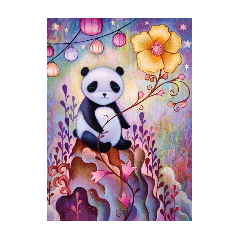 Donde un lindo panda con una flor amarilla se sienta en una roca cubierta de linternas de colores es definitivamente un lugar de felicidad …