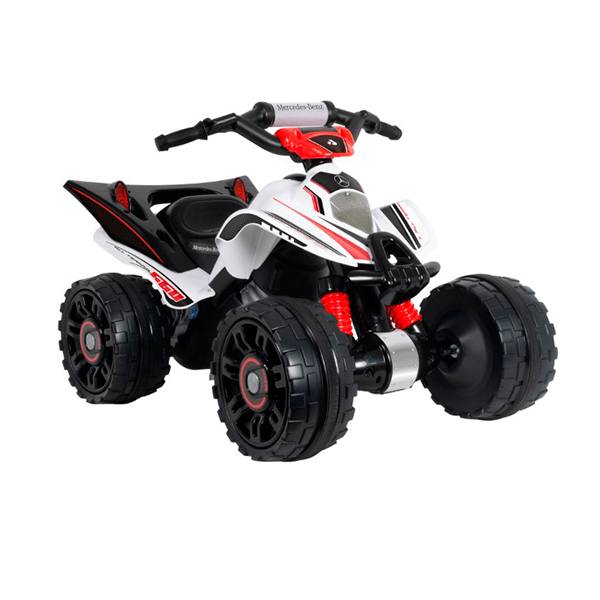 Quad Mercedes Benz de 12V para niñas y niños a partir de 2 años, gracias a la estabilidad que proporcionan sus anchas ruedas y a su fácil manejo a través del pedal acelerador.