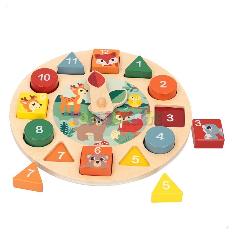 Reloj educativo de madera con figuras encajables.