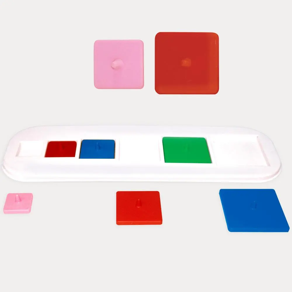 Tablero en el que el alumno coloca en orden creciente o decreciente cuadrados, desarrollando sus habilidades motoras finas, el conocimiento de las figuras y su clasificación.