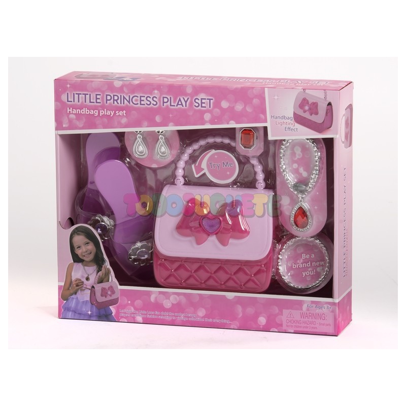 Set de belleza para princesas. Incluye bolso con luz, zapatos de tacón, pendientre, anillo, pulseras y gargantilla.