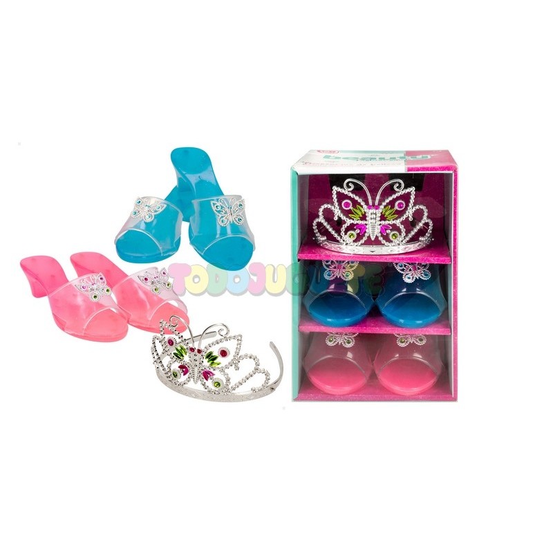 Conjunto de belleza con corona mariposa y zapatos.