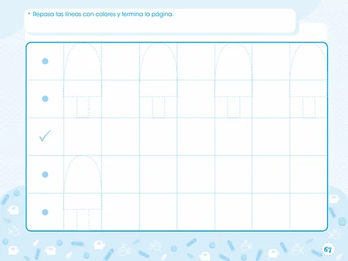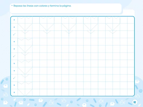 Cuaderno diseñado especialmente para el niño(a) que empieza a manipular las herramientas de escritura (cuaderno y lápiz) y debe iniciar su trabajo escolar con la práctica de los trazos de grafomotricidad, la cuadrícula va disminuyendo su tamaño conforme avanza en su desarrollo, (comienza en hoja blanca y culmina con cuadro alemán) además marca las guías del trazo de las figuras que el pequeño debe retrazar.