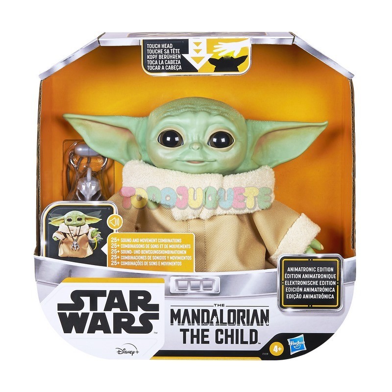 De la colección de Star Wars de Hasbro: ¡The Child de Animatronic Edition con sonidos y secuencias motorizadas! Aunque parezca un «bebé Yoda, esta adorable criatura se llama The Child, y ahora tú puedes convertirte en su protector con este muñeco animatrónico de Star Wars. Toca la parte superior de la cabeza de The Child de Animatronic Edition y activarás 25 combinaciones de sonidos y movimientos, como sonidos que denotan felicidad, emoción, risitas o murmullos entre otros. Los oirás mientras se le mueve la cabeza hacia arriba y hacia abajo, las orejas hacia delante y hacia atrás, y cierra y abre los ojos. Niños y niñas de al menos 4 años podrán hacer como que tienen el poder de La Fuerza cada vez que The Child cierre los ojos, levante el brazo o suspire como si estuviera empleando infinidad de energía.