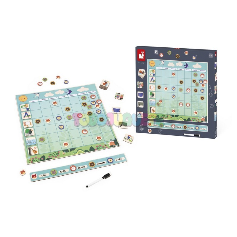 ¡Mamá, en mi organizador tú serás el gato y mi hermanito el ratón! ¡Cuando la semana está llena de actividades diarias y los niños se sienten un poco perdidos, un organizador para toda la familia puede ser una gran solución! ¡Con esta pizarra magnética con preciosas ilustraciones, la organización familiar es un juego de niños! Solo hay que rellenar las casillas de actividades de lunes a domingo par toda la familia (hasta 5 personas). Paseos, tareas domésticas, actividades deportivas, clases de música cada niño sabrá qué le toca y será más autónomo visualizando su programa semanal. Ideal para niños a partir de 3 años, esta agenda magnética tiene 20 imanes de actividades, 55 imanes de personajes (para los miembros de la familia), 7 pegatinas de los días de la semana en varios idiomas y 1 rotulador borrable para escribir el nombre de cada persona en la parte inferior. ¡Esta pizarra grande de cartón de 38 x 40 cm quedará perfecta en cualquier parte de la casa! Por ejemplo, se puede pegar al frigorífico gracias a su cara magnética.