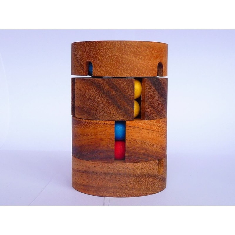 RETO: Girar los 4 niveles de madera para obtener una canica de color en cada columna. Éste es el abuelo del Cubo de Rubik: antiguo rompecabezas asiático, muy difícil.