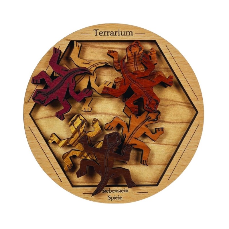 El desafío que se presenta consiste en encajar meticulosamente las siete salamandras planas dentro del marco del terrario, de tal manera que todas las piezas queden perfectamente ubicadas, sin superponerse ni dejar espacios vacíos. Cada salamandra cuenta con un diseño y forma distintivos, lo que añade un nivel adicional de complejidad al intentar acomodarlas de manera armoniosa en el espacio limitado del terrario.
