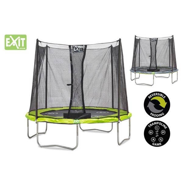 Trampolín Twist de 244 cm de diametro. Incluye red de seguridad. Fabricado con materiales de alta calidad que aseguran una gran robustez y aportan seguridad en el juego. La lona es reversible y en dos colores diferentes: verde y gris. Apto para uso en interiores y exteriores. Edad recomendada: +3 años.