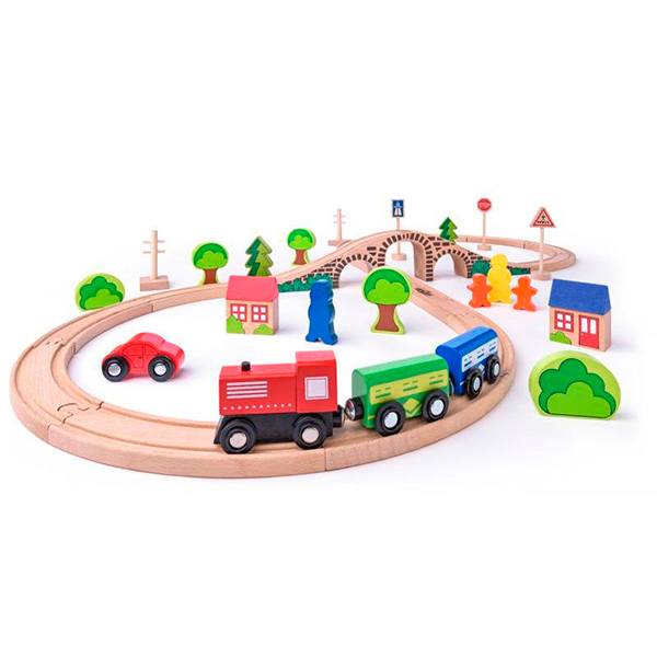 Contiene diferentes tramos de vía para montar un circuito en forma de 8. Incluye un puente, una locomotora y 2 vagones, árboles, casitas, 1 coche, una família de madera y señales de tráfico.
