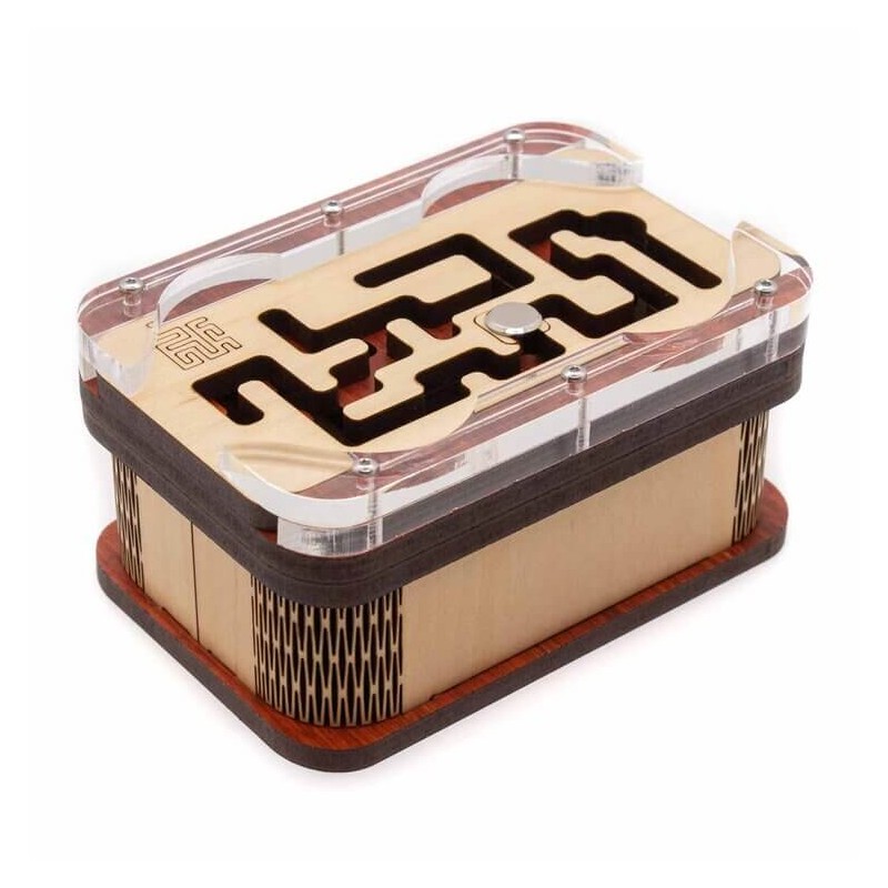 Una gran caja de rompecabezas en la que hay que navegar con el pasador metálico a través del laberinto de doble capa de la parte superior para poder abrirla. La posición inicial está indicada por un pequeño cuadrado grabado, por lo que el jugador puede invertir el reto e intentar volver a colocar la clavija en la posición original una vez abierta la caja.